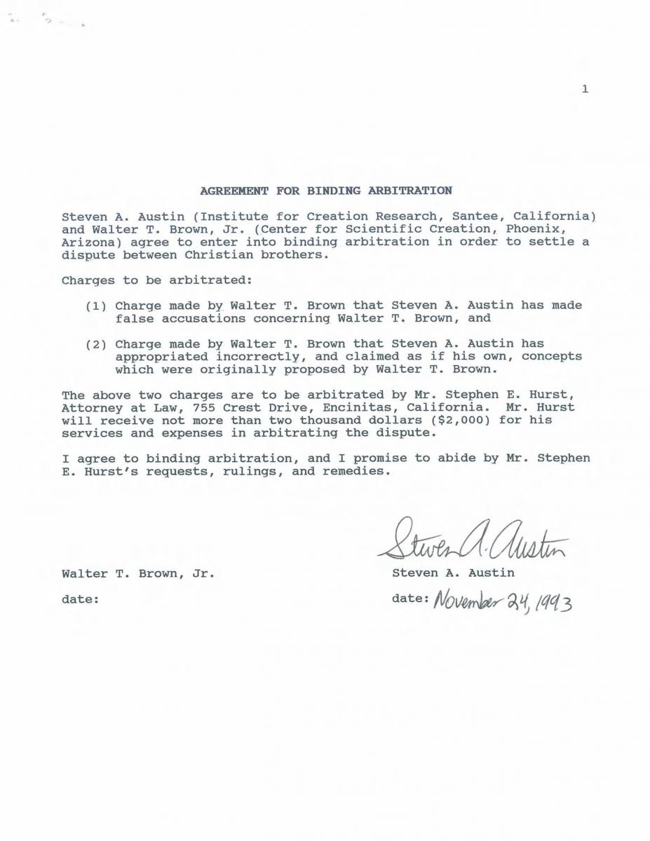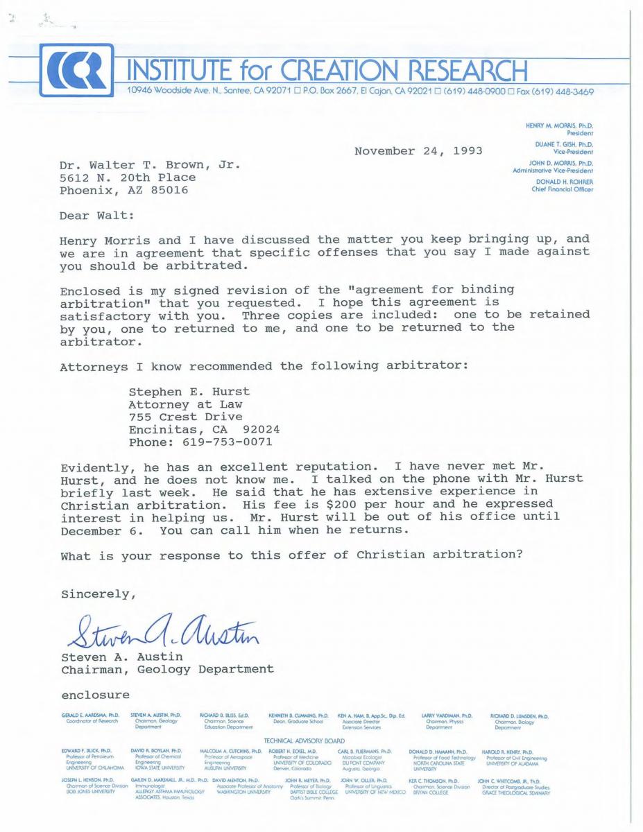Date: Wednesday, November 24, 1993 https://www.creation-controversy.com/sites/default/files/docs/93_11_24_Austin_to_Brown.pdf Tags: AustinBrownMediation 30 reads